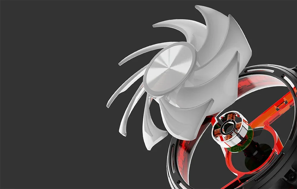 Ventiliatorius naudoja 9 specialiai suformuotas mentes, sukurtas optimizuotam oro srautui ir tylesniam veikimui. Šis dizainas pagerina aušinimo efektyvumą, išlaikant žemą triukšmo lygį.