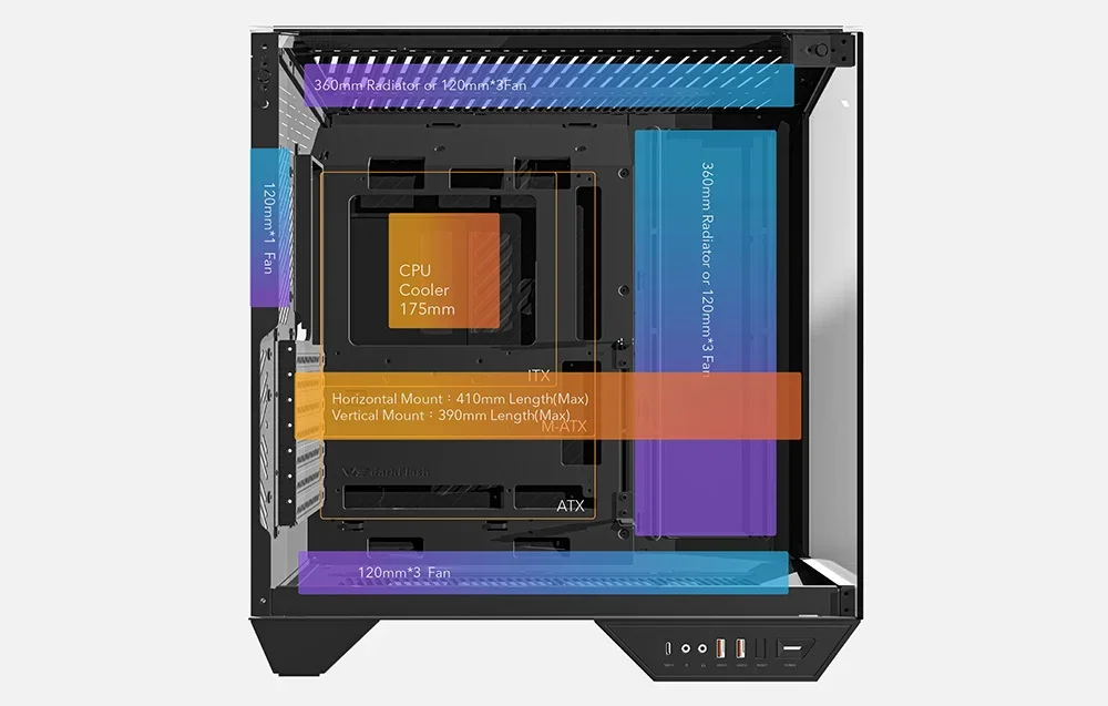 Darkflash DY470 korpusas suderinamas su ATX pagrindinėmis plokštėmis, turinčiomis back-connect sistemą, leidžiančią paslėpti daugumą kabelių. Toks erdvės organizavimas užtikrina tvarkingą vidinį vaizdą ir palengvina kabelių tvarkymą. Pamirškite neestetiškai atrodančius kabelius, matomus pro priekinį skydelį!