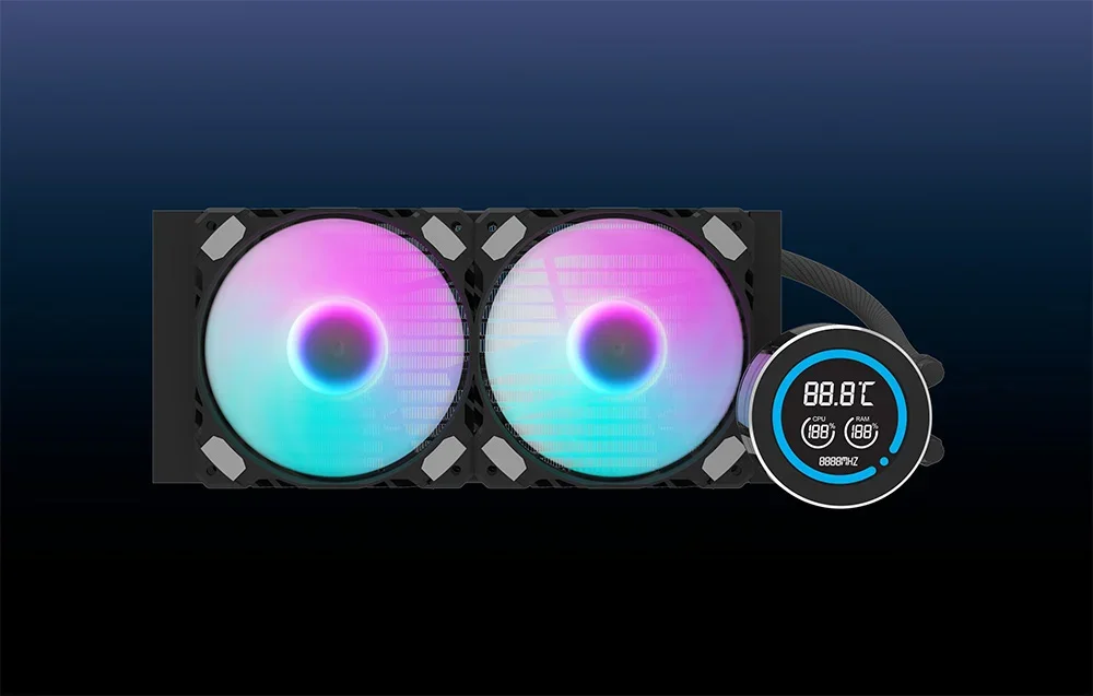 Darkflash DN-D240 – tai aukštos kokybės 240 mm vandens aušintuvas, užtikrinantis stabilų procesoriaus veikimą žemoje temperatūroje. Jis turi varinį vandens bloką ir aliuminį radiatorių, efektyviai išsklaidantį šilumą, kas yra būtina esant dideliam sistemos apkrovimui. Du 120 mm ventiliatoriai su hidrauliniais guoliais, PWM valdymu ir ARGB apšvietimu garantuoja optimalų oro srautą ir tylų veikimą. LCD ekranas leidžia stebėti procesoriaus ir RAM temperatūras, o IIR+EPDM vamzdeliai užtikrina aukštą atsparumą temperatūrai ir ilgaamžiškumą.