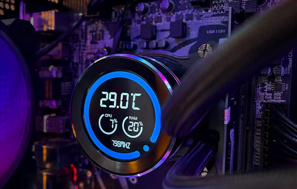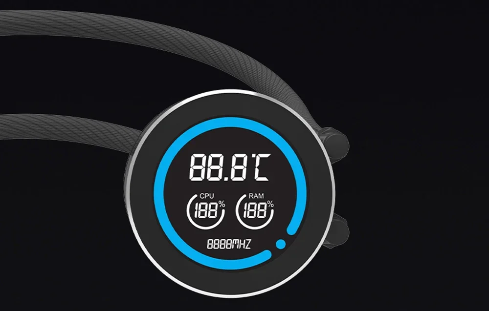 Vandens blokas turi 2,1 colio LCD ekraną su 480x480 pikselių raiška ir 16,7 milijono spalvų. Jis teikia informaciją apie procesoriaus (CPU), RAM temperatūrą ir siurblio greitį, leidžiant stebėti parametrus tiesiogiai ant aušintuvo. Tai leidžia lengvai pritaikyti sistemą pagal jūsų poreikius.