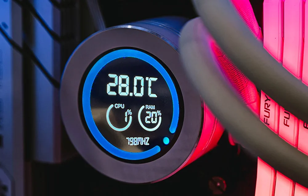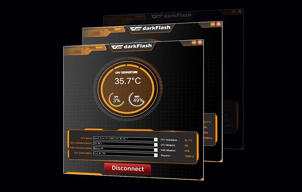 Vandens blokas turi 2,1 colio LCD ekraną su 480x480 pikselių raiška ir 16,7 milijono spalvų. Jis teikia informaciją apie procesoriaus (CPU), RAM temperatūrą ir pompos greitį, leidžiant stebėti parametrus tiesiogiai ant aušintuvo. Tai palengvina sistemos pritaikymą pagal jūsų poreikius. Darkflash produktas taip pat veikia su specialia programine įranga, leidžiančia pilnai valdyti aušinimo nustatymus ir stebėti sistemos našumą. Dėka intuityvios sąsajos galite reguliuoti ventiliatorių greitį ir stebėti procesoriaus bei kitų komponentų temperatūrą.